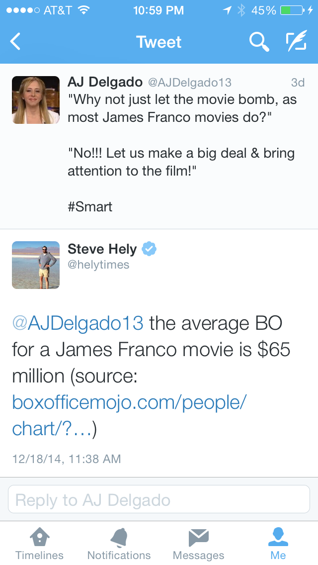Look, I haven’t seen the movie. Maybe it’s terrible. Maybe it’s amazing. Probably, like 90% of movies, it’s in between. But I don’t like a knee jerk critical reaction that it’s dumb. (I don’t really like critics at all, to be honest.) If you think The Interview sucks, then you star in one of the best TV shows ever, go on to make cool, fun, talked-about and also wildly profitable comedies, or win an Oscar for single handedly carrying a pretty experimental movie that not only was a huge hit but also cinematically daring and innovative, and build the clout to create your own $44 million projects on the strength of your talent and very perceptive grasp of what stories an audience of millions wants to see.