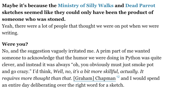 Reminded me of a bit from this recent John Cleese interview in Vulture about the influence of drugs on Monty Python: