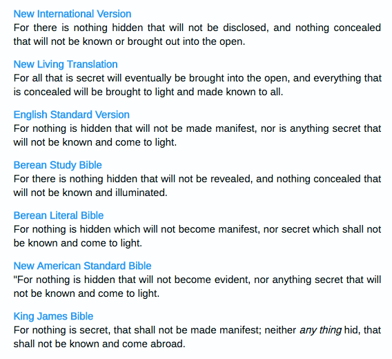 The time is coming when everything that is covered up will be revealed, and all that is secret will be made known to all.