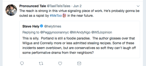 Toughen up, Hely! Your point about the recipes was both fundamentally sound — McCardle’s prissy legalism notwithstanding, we all know there is stealing and stealing — and expressed with warmth and good-fellowship toward liberals and conservatives alike. You can’t be intimidated by the cliched, conversation-stopping, pseudo-judgement — virtue signalling by way of referring to virtue signalling — of a guy whose Twitter handle is a set of instructions about how to pronounce his name.