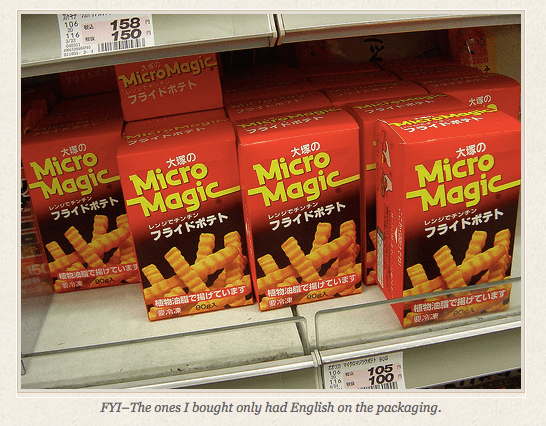 Google led me to that image of Micro Magic fries on the website of New Adult Contemporary Romance author Jennifer Friess (don’t know if it’s a coincidence that her name is fries)