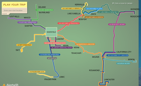 From Lancaster, you could connect on Kern Valley Transit and go as far as Lost Hills or Delano, or even out to Ridgecrest.