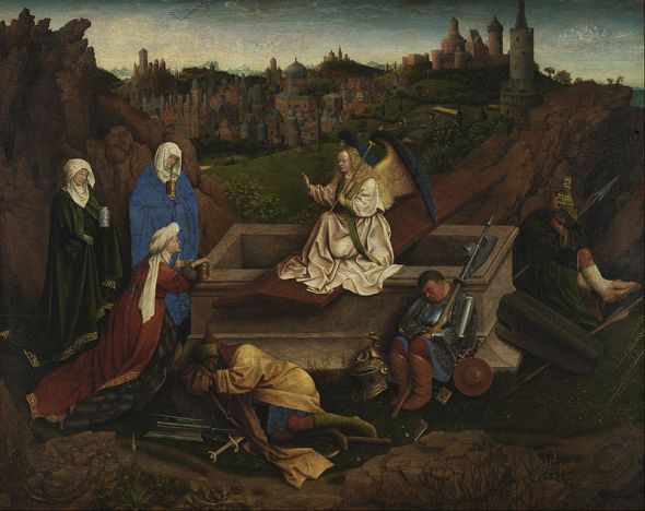 Van Eyck undertook a number of journeys on Philip the Duke of Burgundy’s behalf between 1426 and 1429, described in records as “secret” commissions, for which he was paid multiples of his annual salary. Their precise nature is still unknown, but they seem to involve his acting as envoy of the court. In 1426 he departed for “certain distant lands”, possibly to the Holy Land, a theory given weight by the topographical accuracy of Jerusalem in The Three Marys at the Tomb, a painting completed by members of his workshop c. 1440.