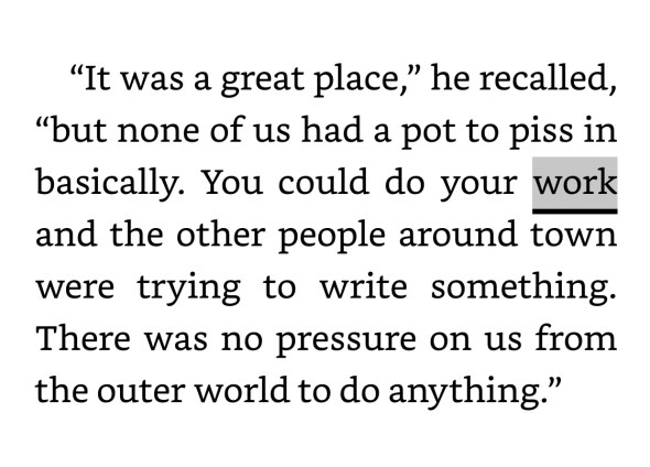 This is a book about a scene, and the scene was Key West in the late ’60s-’70s, centered on Thomas McGuane, Jim Harrison, Hunter Thompson, Jimmy Buffett, and some lesser known but memorable characters. I tried to think of other books about scenes, and came up with Easy Riders, Raging Bulls by Peter Biskind, and maybe Astral Weeks: A Secret History of 1968 by Ryan H. Walsh, about Van Morrison’s Boston. Then of course there’s Hemingway’s A Moveable Feast, referenced here in the subtitle, a mean-spirited but often beautiful book about 1920s Paris.