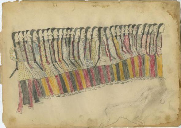Artist unknown, 1881, from the Bethel Moore Custer Ledger, one of many amazing works over at Plains Indian Ledger Art.