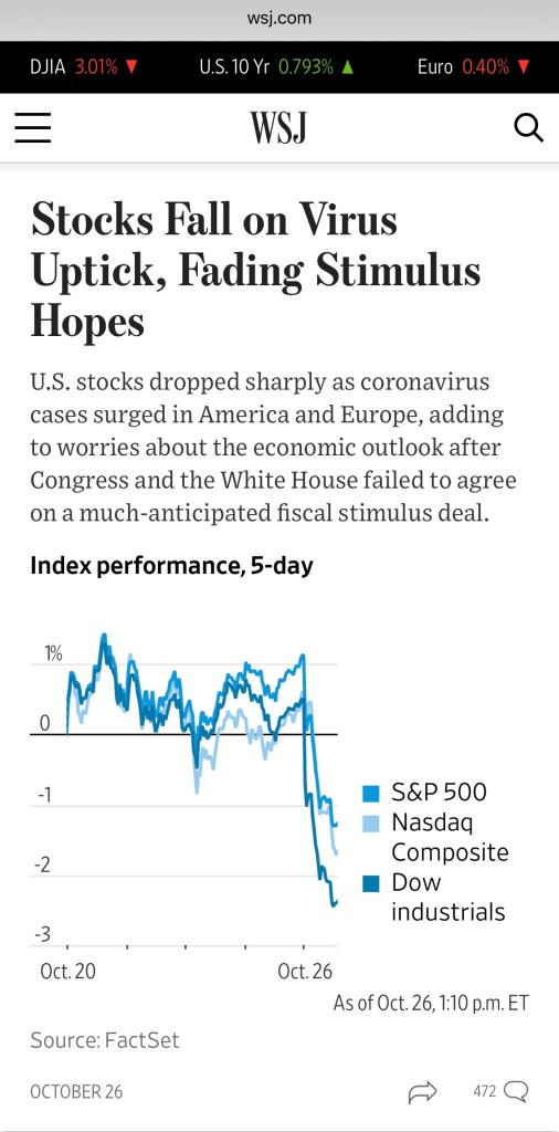 Maybe “the stock market” is down because people are starting to realize the holidays will be a bummer, or the election picture feels less clear than it did a week ago, or weather has turned in gloomy ways, or the elections in Chile and Bolivia indicate the left is on the march and the right is in retreat, or it’s foggy in New York City today, or instability in general is in the air when the President storms out of his 60 Minutes interview and the other guy is hardly at the top of his game.