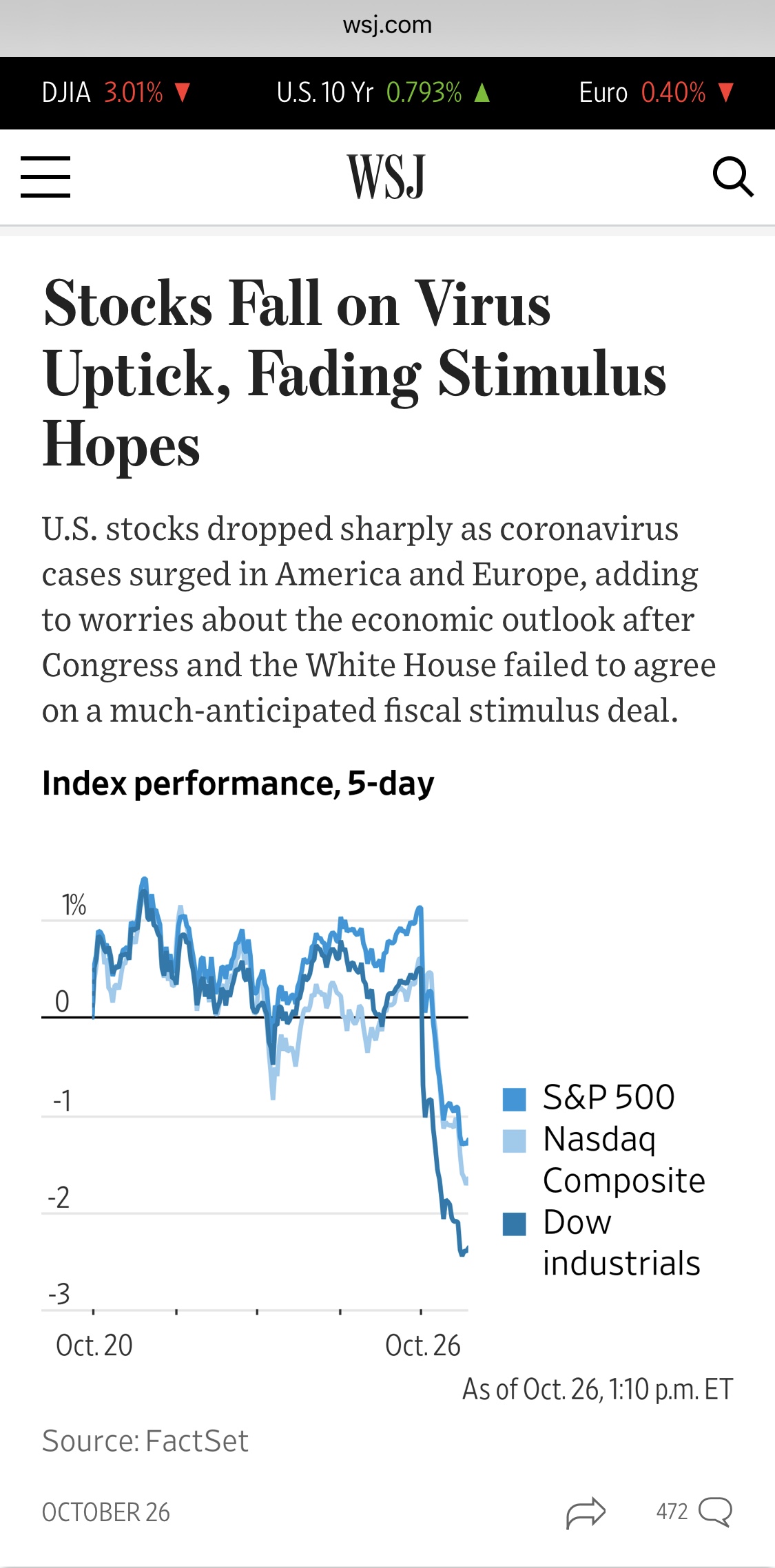 Maybe “the stock market” is down because people are starting to realize the holidays will be a bummer, or the election picture feels less clear than it did a week ago, or weather has turned in gloomy ways, or the elections in Chile and Bolivia indicate the left is on the march and the right is in retreat, or it’s foggy in New York City today, or instability in general is in the air when the President storms out of his 60 Minutes interview and the other guy is hardly at the top of his game.