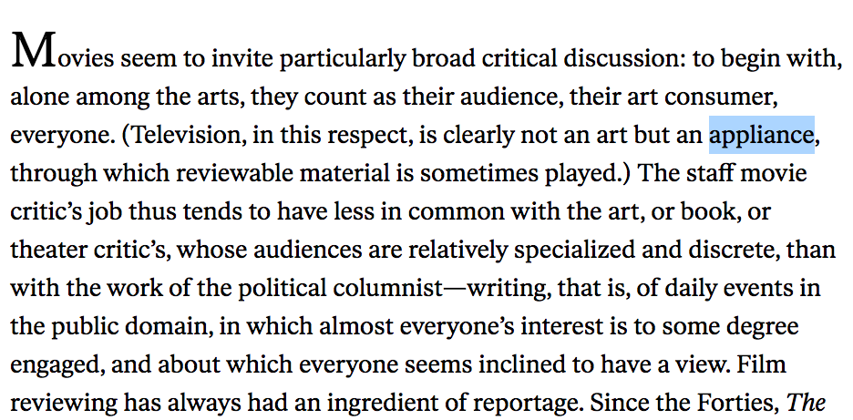 From those same archives, Renata Adler’s savage attack on Pauline Kael drops a parenthetical on TV: