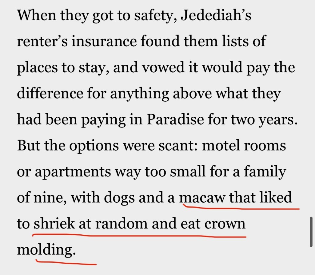 Good first sentence for a novel there. Mike Nimz, quoted by Joe Mozingo in this LA Times piece on refugees from the Camp fire, the one that destroyed the town of Paradise in 2018.