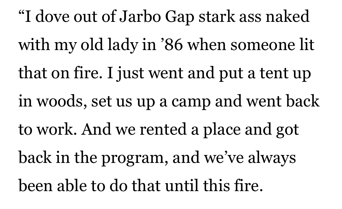 Good first sentence for a novel there. Mike Nimz, quoted by Joe Mozingo in this LA Times piece on refugees from the Camp fire, the one that destroyed the town of Paradise in 2018.