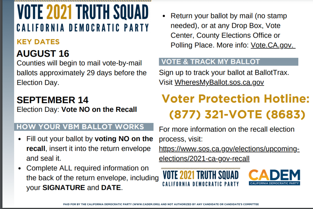 The Truth Squad Palm Card the California Democratic Party makes available tells you to vote NO, but then doesn’t tell you which of the other candidates to vote for. There’s been some online discussion of what to do about that, with some fanatics arguing you shouldn’t bother voting for a possible replacement candidate, because it might be confusing (to your own mind?)