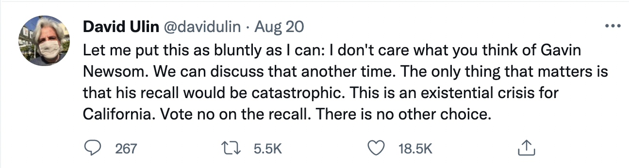 No one can really gin up much passion for Gavin Newsom at the moment without sounding ridiculous. The arguments on behalf of the anti recall campaign are so deflating as to be comical.