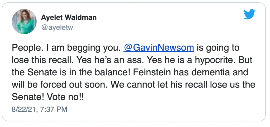 One of our senators here in California, Diane Feinstein, is 88 years old (you read that right). An age where she shouldn’t be allowed to drive a car let alone be a senator. It’s not openly discussed, but it is closedly discussed, that she is demented and can’t remember who is who, let alone details about complex legislation. So, an argument for Newsom has emerged that’s like, “you must keep our terrible governor so that he can appoint the replacement for our demented senator!”