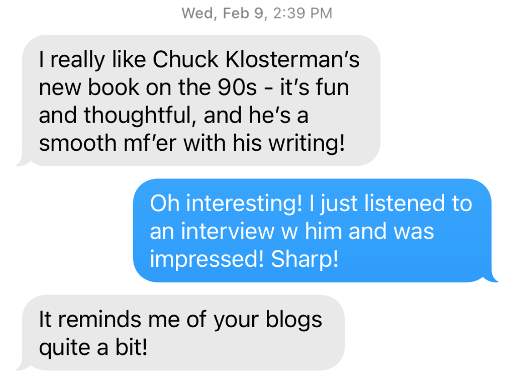Chuck Klosterman is seven years older than me (if we believe Wikipedia). Some of his obsessions (Motley Crüe, Guns n Roses), even the idea of manically chasing to their endpoint the meaning of obsessions with a rock band, are just a click or two beyond of my own experience with pop culture, so some of his earlier books, although intriguing, I just never got the activation energy to read. Then I got this text from my buddy Sgro, who I met around 1993 or 94, with whom I spent many summers in the Nineties: