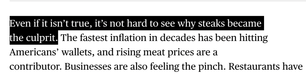That’s from Bloomberg, article headlined: Anxiety Over Beef Shortages Reaches Fever Pitch in Golden Corral Fistfight, and subheadlined When a fistfight broke out at the chain, initial reports attributed it to steak shortages