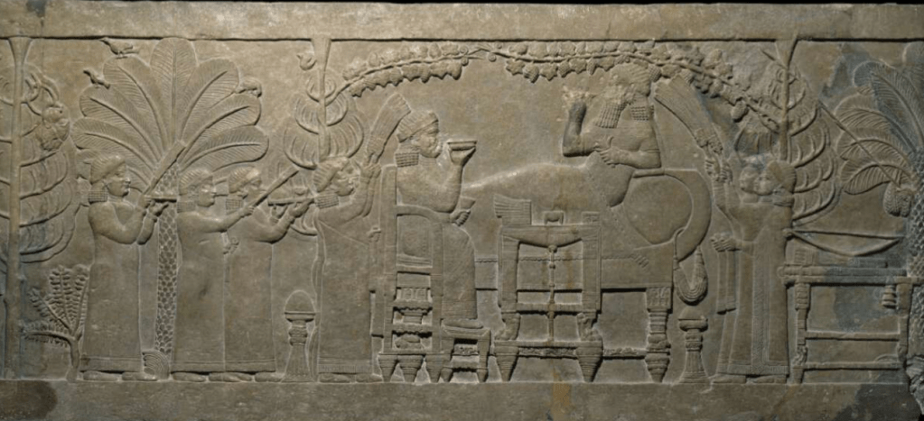 Posted: September 14, 2022 Filed under: art history Leave a commentIn this relief, created around 645 BCE or so, excavated two thousand four hundredsome years later in 1853 or so in what’s now Iraq, brought to The British Museum, we see the ruler Ashurbanipal lounging and listening to tunes while to the left the decapitated head of Teumman, king of Elam, hangs from a tree.