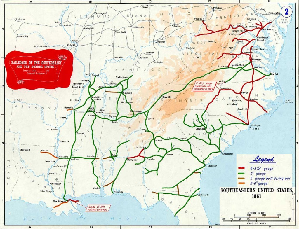 It’s illuminating when studying the Civil War to make reference to a map of the railroads of the Confederacy. Here’s West Points map thereof: