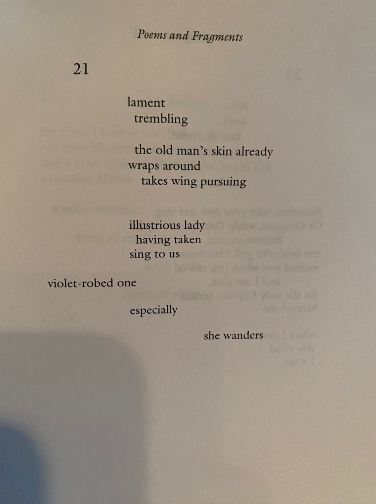 Spooky! A call from the distant past. In their introduction Rayor and Landinois paint a picture of Sappho as something like a 600 BCE Lana Del Rey, gathering a circle around her on Lesbos (closer to Turkey than to Greece).