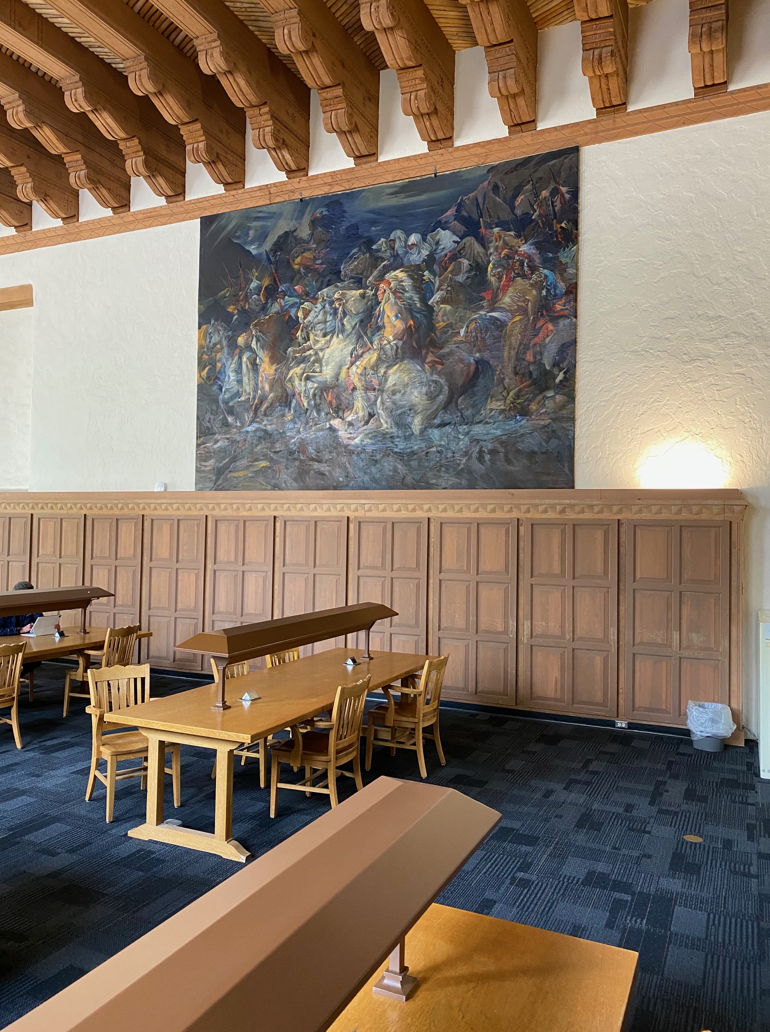 We poked our heads into the Zimmerman library to see Kenneth Adams’ WPA-era murals, Three Peoples. However, the librarian informed us these are now covered, because, as she put it, some people find them offensive.