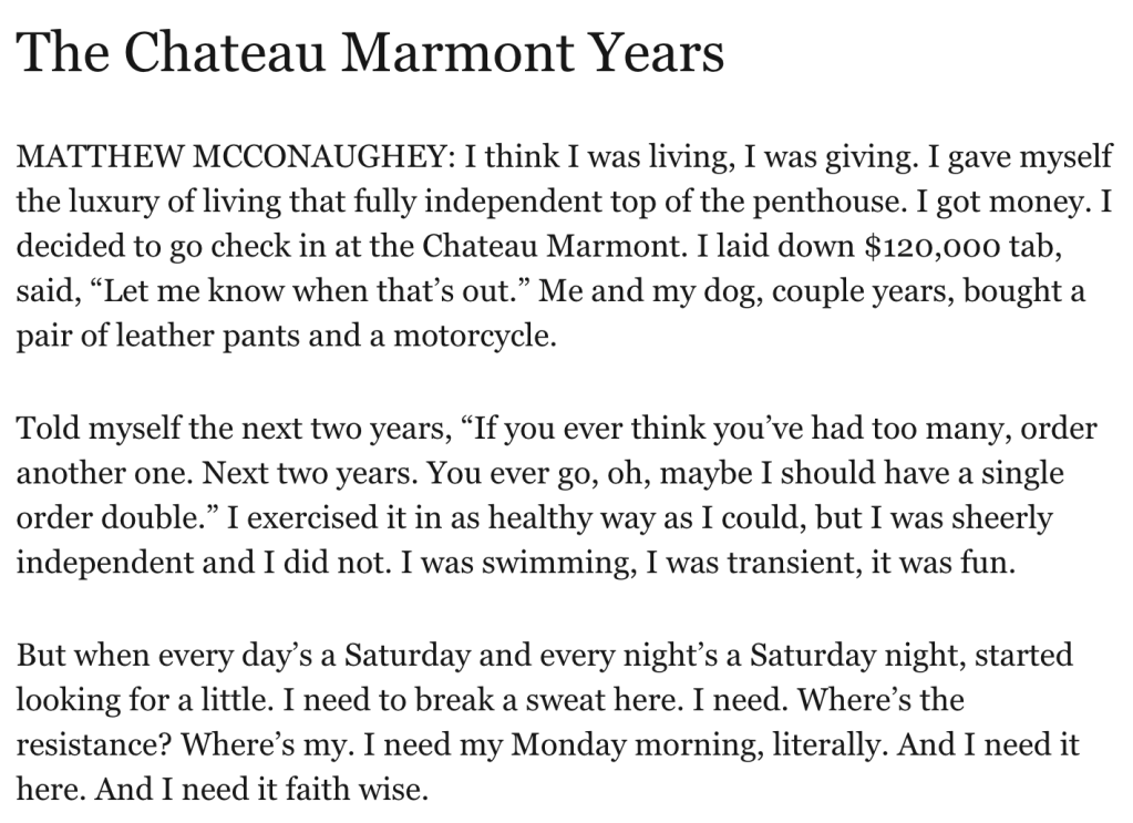 Greenlights is best received as an audiobook, as that’s how McConaughey composed it, talking into a microphone while driving: