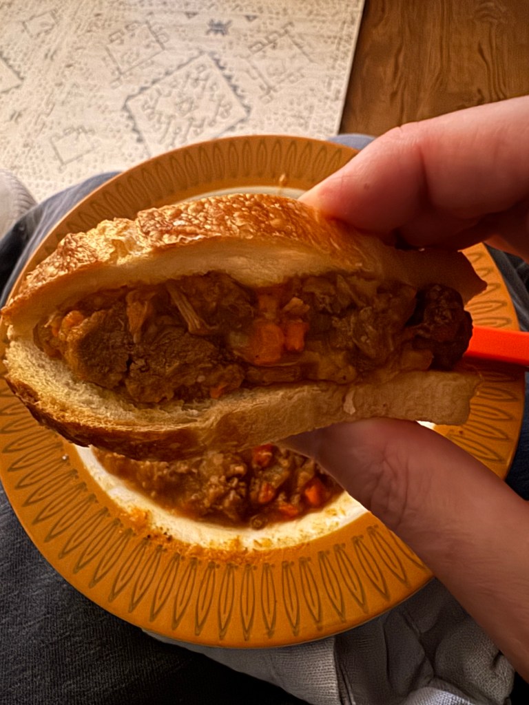 Picked up some beef stew with a piece of bread, and wondered if you really need two slices. Was the first sandwich more like this, a kind of Anglo taco?