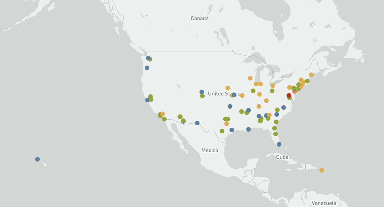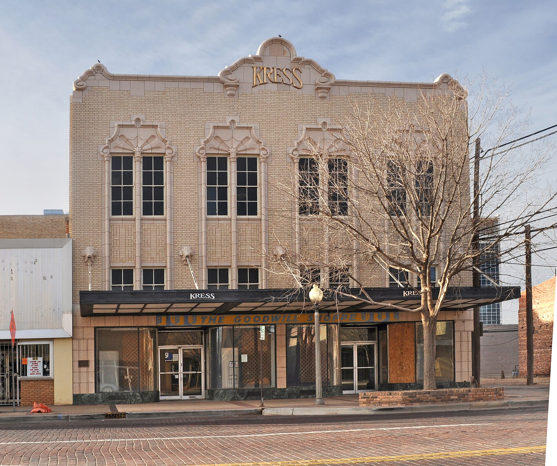 The most distinctive and best remembered Kress stores are a group of more than fifty Art Deco buildings dating from 1929–1944 and designed by Edward F. Sibbert (1899-1982), the company’s longtime chief architect. Sibbert’s buildings streamlined the Kress image by using sleek modern facades, simple yet distinctive ornament, and colors characteristic of the Kress brand. Curved glass display windows led the shopper through heavy bronze doors into an interior of rich marbles, fine woods, and large customized counters set crosswise down a long sales floor. Well-positioned hanging lamps created a bright atmosphere for an endless array of inexpensive items (there were 4,275 different articles on sale in 1934). Everything – from the constantly restocked merchandise to the gracious retiring rooms and popular soda fountains in the basement – encouraged customers to linger. Like the great movie houses of the day, the “dime store” – and ‘Kress’s’ in particular – was a popular destination during hard economic times.