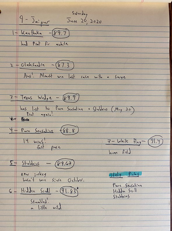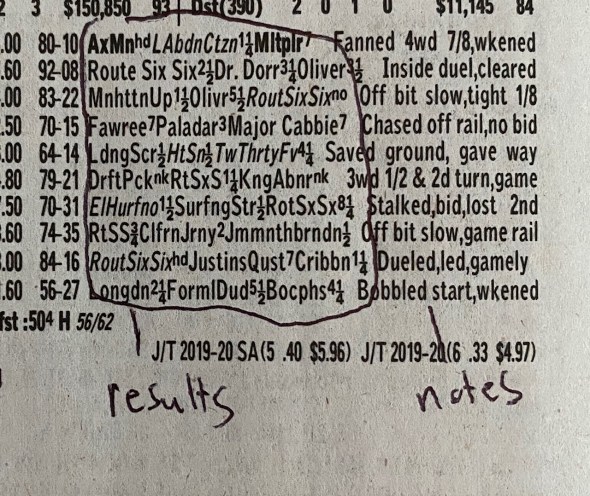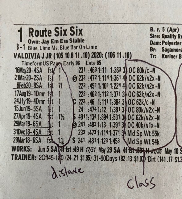 Using the very helpful resources provided by the late Neil Benoit’s Getting Out Of The Gate website, which has a Racing 101-401 course, I was able to grasp the basics. This resource at Art of Manliness was also quite helpful, and there’s a Wikihow about racing forms, but it’s Benoit who really gave us a gift.