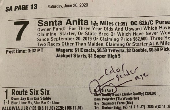 Let’s take as our example the first horse, Route Six Six, in the 7th race tomorrow (Saturday, June 20) at Santa Anita.