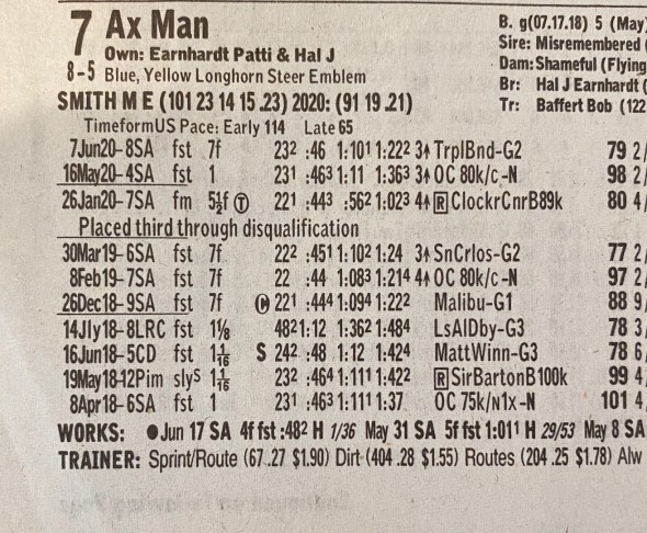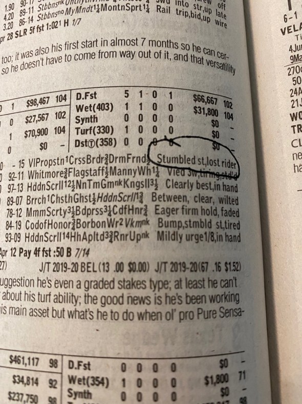 What’s that about? Here we see the pleasures and oddness of the Racing Form as compressed storytelling: