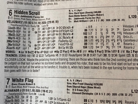 Readers, I just idly checked out the 9th race at Belmont today, the Jaipur. Will be televised on NBC. I noticed Hidden Scroll, a very fast horse, had something aberrant in his last race: