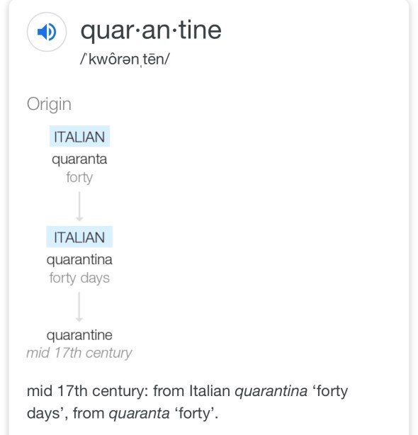 Within a century, cities extended the isolation period from 30 to 40 days, and the term changed from trentino to quarantino—the root of the English word quarantine that we use today.