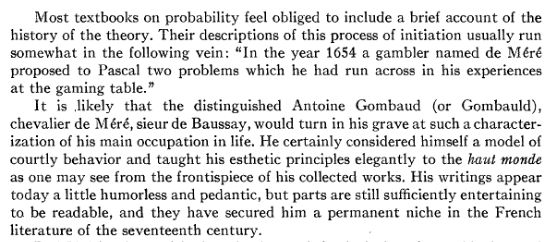so reports Oystein Ore, writing in the May 1960 issue of The American Mathematical Monthly (vol 67, No. 5, “Pascal and the Invention of Probability Theory”). Oystein Ore says: