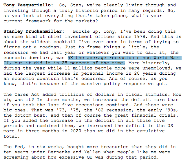 It’s a fascinating time. We’ve never really seen what shoveling money in on the basis that we’re doing it on a fiscal basis, while following a monetary policy of something close to zero interest rates, and it is enormously pleasant. But in economics, there’s one thing always to remember, you can never do one thing, you always have to say, “And then what?”