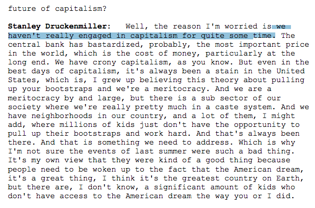 MUNGER: And I think one consequence of the present situation is that Bernie Sanders has basically won. And that’s because with the, everything boomed up so high and interest rates, so low what’s going to happen is the millennial generation is going to have a hell of a time getting rich compared to our generation. And so the difference between the rich and the poor and the generation that’s rising is going to be a lot less. So Bernie has won. He did it by accident, but he won.