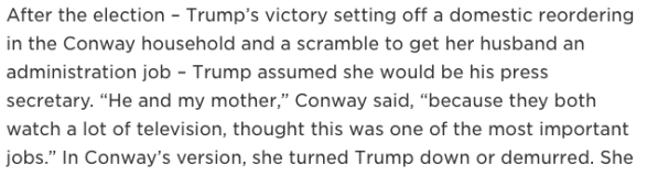 But we never really thought about Trump’s mother. Mothers should be off limits maybe? Even Trumps have mothers. A hasty misreading of this Kellyanne Conway quote: