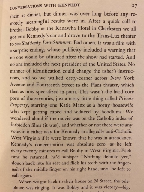 This wasn’t the hard-core porn of the seventies, just a nasty little thing called Private Property, starring one Katie Manx as a horny housewife who kept getting raped and seduced by hoodlums. We wondered aloud if the movie was on the Catholic index of forbidden films (it was) and whether or not there were any votes in it either way for Kennedy in allegedly anti-Catholic West Virginia if it were known that he was in attendance. Kennedy’s concentration was absolute zero, as he left every twenty minutes to call Bobby in West Virginia. Each time he returned, he’d whisper “Nothing definite yet,” slouch back into his seat and flick his teeth with the fingernail of the middle finger on his right hand, until he left to call again.