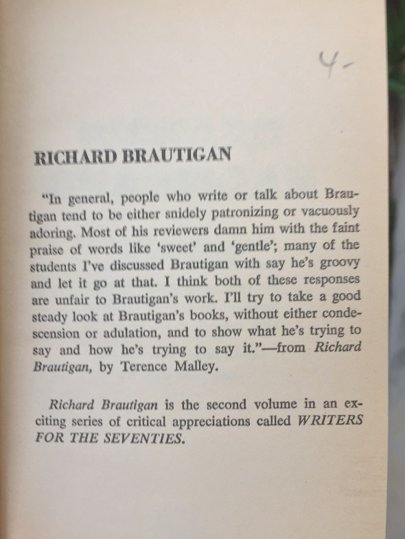 On title alone this book had me. I’d never read Brautigan, cult hero of the age when the Army was giving LSD to draftees. This one came out in 1964.