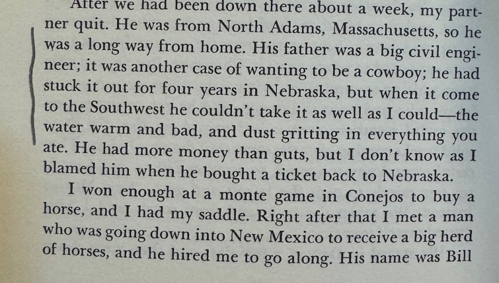 Posted: July 29, 2024 Filed under: cormac, Texas, the American West Leave a commentI’ve been working my way through Larry McMurtry’s short syllabus for understanding the cowboy of the 19th century. Teddy Blue’s memoir is vivid: