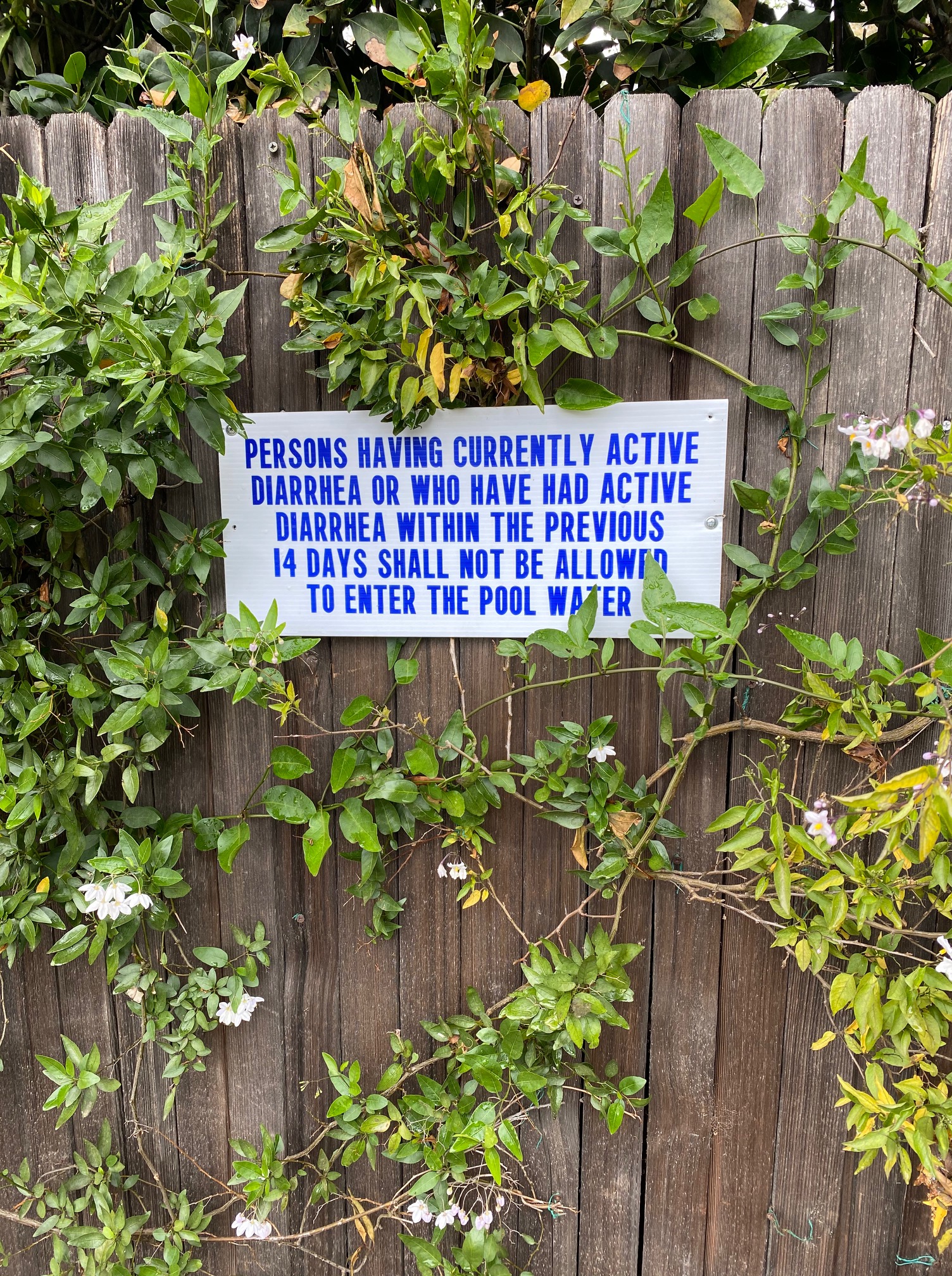 I’ve been pondering this sign for years. It’s not a choice to put it up. The uniform wording and ubiquity suggests there must be a rule. So that means there must’ve been some kind of meeting at a regulatory agency or the legislature where they discussed the diarrhea danger, and agreed to the diarrhea sign rule. Sometimes I’ve idly wondered if the sign were some kind of prank on pool owners, to force them to make all lucky pool users ponder the word “diarrhea” Did a bureaucrat harboring long-felt resentment against pool enjoyers push this through? Punishment for exclusion from a pool party, years ago?