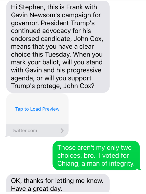 A text from the Newsom campaign cheesed me off: