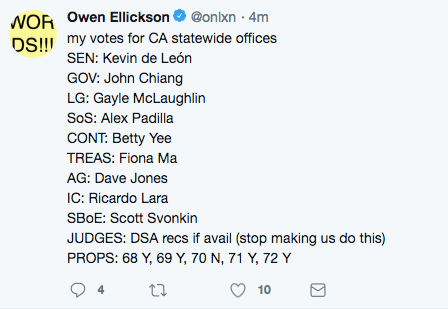 At the last second, early voting, I went for Dianne Feinstein. INSANE that we have an 86 year old Senator, I get primarying Lady D, but Kevin De Leon took money from Cadiz, an evil water company out in the desert that’s trying to drink our national preserve’s milkshake.