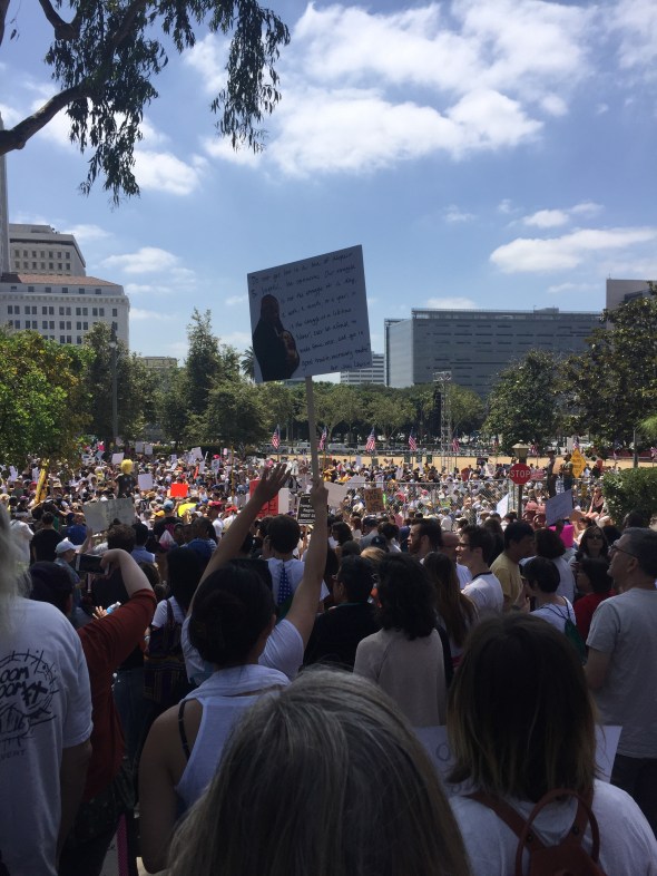 - One of the few speakers I heard most of was from the American Indian Movement. She focused on the raping and misery aspects of California’s mission history and the history of Los Angeles. While there’s an important place for that history to be considered, I felt this was a bummer approach, and contrary to the goal of gathering, organizing, mobilizing, and inspiring large numbers of people. Though I myself had nothing to do with the raping of California’s native people, and retroactively disapprove of it, hard not to feel a little bit judged for enjoying the California which has emerged. Legislating the crimes of two hundred years ago can be cathartic, but I’m afraid the villains at this point have largely escaped justice. The goal here is to get a lot of people together and united, right?
