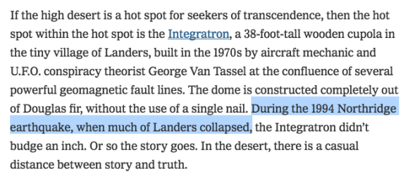 writer of this article says a number of wrong things, including confusing the 1994 Northridge earthquake for the 1992 Landers earthquake. Easy to get a fact wrong, I do it every day, but it’s pretty funny to pair it with a cliché about how people in the desert are always making up stuff.