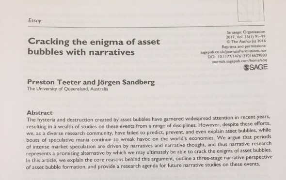 “Cracking the enigma of asset bubbles with narratives,” by Preston Teeter and Jörgen Sandberg in Strategic Organization. You can download a PDF for free.